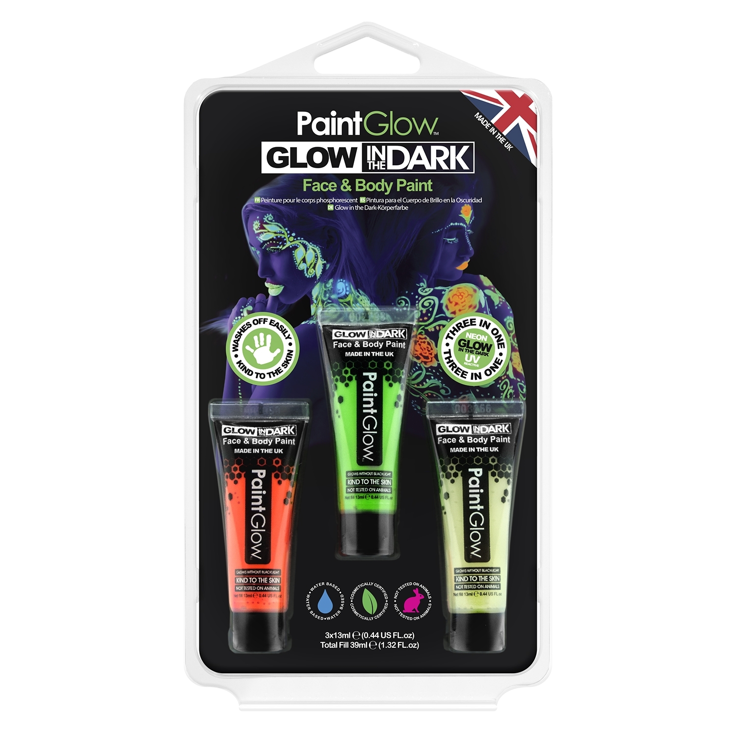 Ces peintures/maquillages fluo pour le visage et pour le corps se nettoient facilement à l'eau. Les produits Paintglow sont :